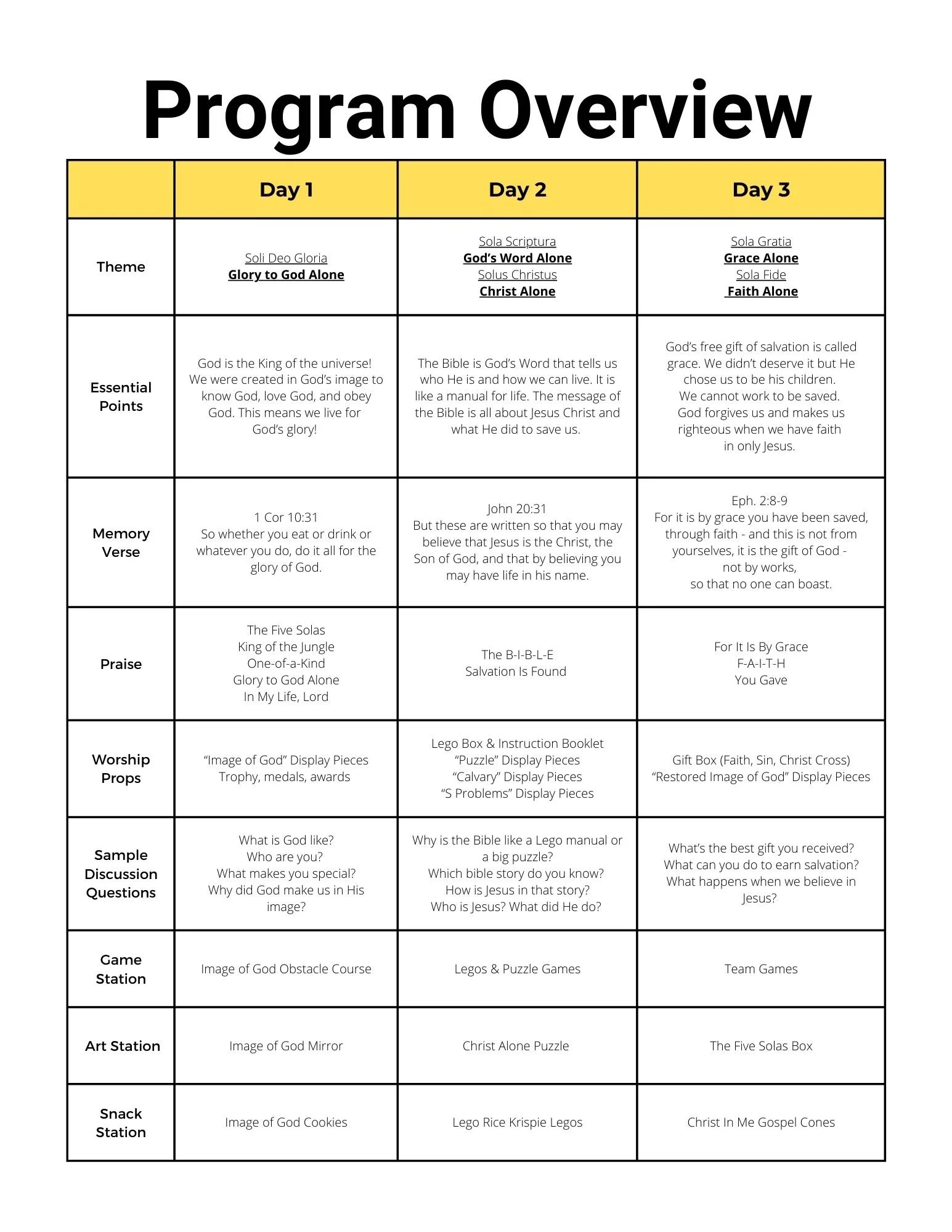 Although the words of the Five Solas are in Latin and may seem difficult for children to understand, these fundamental principles are essential for all Christians to believe. This VBS curriculum was created to help deliver these timeless truths to children in a Christ-honoring and developmentally appropriate manner. I pray that church leaders, parents, and teachers are faithful and diligent in teaching the next generation the whole counsel of the Word of God, starting with this most important message of the Five Solas. May the Lord grant his wisdom, strength, creativity, and guidance as you seek to deliver God’s Word to the precious children in your care.
